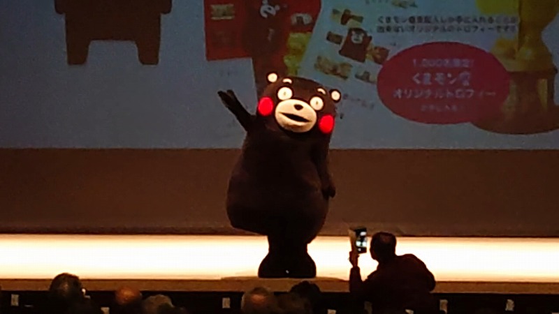まだ木の香りの残るメインホールでの2日目は大会式典、中央情勢報告のあと、放送作家・脚本家で「くまモン」の生みの親でもある小山薫堂氏による記念講演「幸せの企画術」がありました。講演の最後には「くまモン」も登場し、歓声が上がりました。